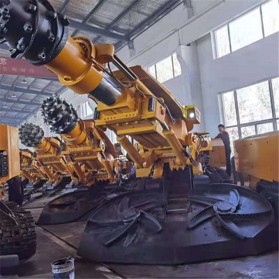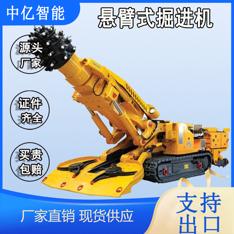 截割頭裝在懸臂上的部分斷面掘進機。懸臂式掘進機要同時實現剝離煤巖、裝載運出、機器本身的行走調動以及噴霧除塵等功能,即集切割、裝載、運輸、行走于一身。它主要由切割機構、裝載機構、運輸機構、行走機構、機架及回轉臺、液壓系統、電氣系統、冷卻滅塵供水系統以及操作控制系統等組成。其中切割臂、回轉臺、裝渣板、輸送機、轉載機、履帶等為主要工作機構。