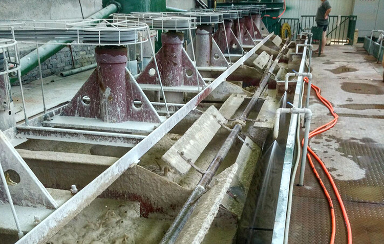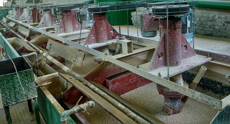 一般螢石選廠的工藝為原礦碎碎、閉路磨礦、浮選。浮選有一次粗選一次掃選。精礦三次以上,六次也常見。精礦一般達到品位98%,回收率75%以上。